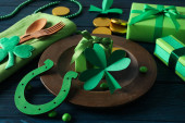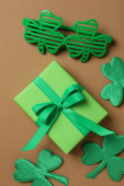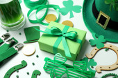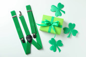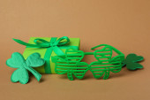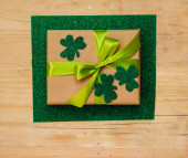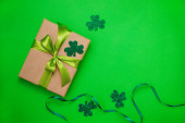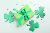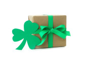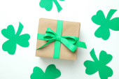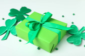 Liść koniczyny i pudełko prezentów izolowane na białym tle