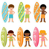 Dzieci na plaży, gry wodne, pływanie, letnie wakacje na plaży. Dzieci pływają i bawią się w ilustracje wektorowe. Chłopcy i dziewczęta odpoczywają na plaży