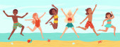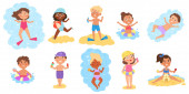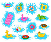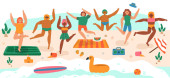 Basen dla dzieci, dzieci bawiące się w gumowe kółka pływackie. Wielorasowych chłopców i dziewcząt w strojach kąpielowych stojących razem wektor zestaw ilustracji. Dzieci z gumowymi zabawkami basenowymi
