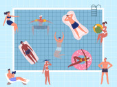 Zdjęcie "Basen dla dzieci, dzieci bawiące się w gumowe kółka pływackie. Wielorasowych chłopców i dziewcząt w strojach kąpielowych stojących razem wektor zestaw ilustracji. Dzieci z gumowymi zabawkami basenowymi" może być wykorzystywane do celów osobistych i komercyjnych zgodnie z warunkami zakupionej licencji Royalty-free. Obraz jest dostępny do pobrania w jakości wysokiej rozdzielczości do 5760x3840.