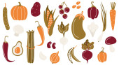 Zestaw świeżych warzyw i ziół. Produkty spożywcze dla zdrowego stylu życia: marchew, pomidory, cebula, czosnek, buraki, papryka, groszek zielony, rzodkiewki, koperek, pomidory, bazylia. Ilustracja wektora.