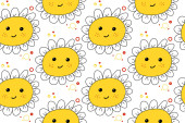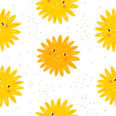 Płynny dziecięcy wzór ze słońcem na białym tle. Projekt dla dzieci.