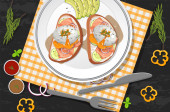 Top widok żywności, jajko Benedict i placemat na czarnym stole ilustracji