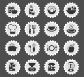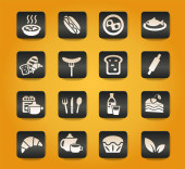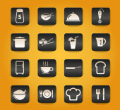 Symbole żywności i kuchni na czarnych przyciskach na żółtym tle