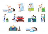 Fryzjer gotowy. Brodaty fryzjer, profesjonalne narzędzia fryzjerskie do golenia, akcesoria i meble. Brzytwa, grzebień, nożyczki, krzesło, lustro, szczotka, wentylator, szampon, ręcznik papierowy, odżywka wektor płaski