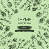 Ramka z gałązką tymianku z liśćmi. Szczegółowe ręcznie rysowane szkice, ilustracja wektorowa botaniczna