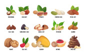 Orzechy i nasiona kreskówki, orzechy włoskie, migdały, słonecznik i pestki dyni. Sosna i orzech brazylijski, pistacje, nerkowca, orzech ziemny, orzech laskowy wektor zestaw