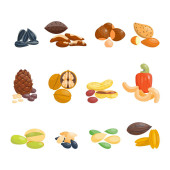 Zdjęcie "Orzechy i nasiona kreskówki, orzechy włoskie, migdały, słonecznik i pestki dyni. Sosna i orzech brazylijski, pistacje, nerkowca, orzech ziemny, orzech laskowy wektor zestaw" może być wykorzystywane do celów osobistych i komercyjnych zgodnie z warunkami zakupionej licencji Royalty-free. Obraz jest dostępny do pobrania w jakości wysokiej rozdzielczości do 5760x3840.