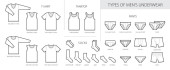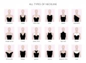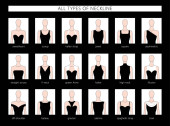 Moda Neckline Rodzaje bluzki damskiej, sukienka, T-shirt Silhouette Icon Collection. Typ kobiecej linii szyi na manekinie. Halter, Dekolt, Słodziutka, typu V-Neckline. Izolowana ilustracja wektora