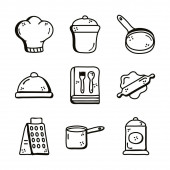 Narzędzia kuchenne i elementy żywności doodle zestaw. Ręcznie rysowane czarny kolor linii sztuki wektor ilustracji. Izolacja na białym tle.