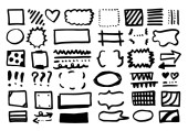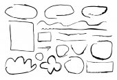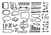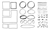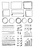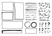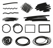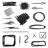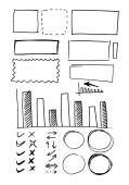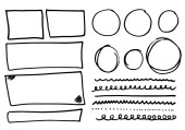 Linie wektorowe Doodle i krzywe.Ręcznie rysowane sprawdzić i znaki strzałek. Zestaw prostych linii doodle, krzywe, ramki i plamy. Kolekcja efektów ołówkowych. Granica bazgrołów. Prosty zestaw bazgrołów.