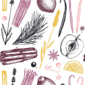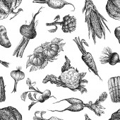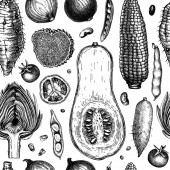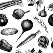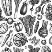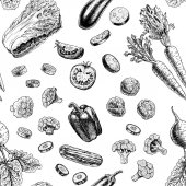 Ręcznie szkicowany tło warzywne. Wektor bezszwowy wzór z ręcznie rysowane elementy żywności. Vintage zdrowe rośliny w grawerowanym stylu. Warzywa tło do pakowania papieru, tkaniny, projekt opakowania