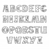 Duże ręcznie rysowane czarne litery angielskiego alfabetu w stylu doodle zarys wektor ilustracja, abc kaligraficzny, cute zabawne dekoracyjne pismo, kontur wyłożone sztuki i liternictwo