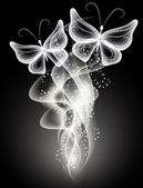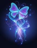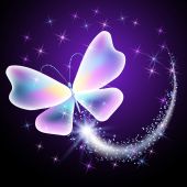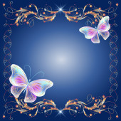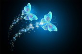 Świecące baśniowe tło z magicznymi niebieskimi motylami i bąbelkami, kwiaty ozdobione i błyszczące gwiazdy. Ramka Fantasy Sparkle składa się z przezroczystych kuli opalizujących, ozdoby kwiatowej i przestrzeni do kopiowania.
