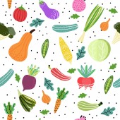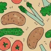 Ręcznie rysowane bezszwowe wzór ilustracji zdrowych warzyw organicznych, pomidor marchew por rzodkiew bakłażan kalafior pszczoły. Rynek naturalne warzywa żywności dieta w miękkich pastelowych kolorach.