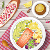 Widok góry śniadanie na drewnianej tacy ilustracji