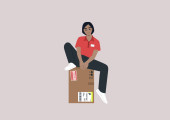 Kobieta rasy kaukaskiej siedząca na szafce z aktami biurowymi, milenium w pracy, codzienna rutyna