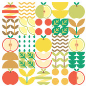 Zdjęcie "Apple ikona abstrakcyjne dzieła sztuki. Projektowanie ilustracji kolorowe jabłko wzór, liście i symbole geometryczne w minimalistycznym stylu. Całe owoce, pokrojone i podzielone. Prosty wektor płaski na białym tle." może być wykorzystywane do celów osobistych i komercyjnych zgodnie z warunkami zakupionej licencji Royalty-free. Obraz jest dostępny do pobrania w jakości wysokiej rozdzielczości do 5760x3840.