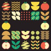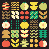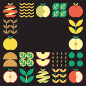 Apple ikona abstrakcyjne dzieła sztuki. Projektowanie ilustracji kolorowe jabłko wzór, liście i symbole geometryczne w minimalistycznym stylu. Całe owoce, pokrojone i podzielone. Prosty wektor płaski na białym tle.