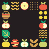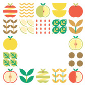 Jabłko ramka abstrakcyjne dzieło sztuki. Projektowanie ilustracji kolorowe jabłko wzór, liście i symbole geometryczne w minimalistycznym stylu. Całe owoce, pokrojone i podzielone. Prosty wektor płaski na białym tle.
