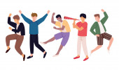 Zestaw szczęśliwych ludzi odizolowanych na białym tle. Skocz z podniesionymi ramionami. Świętujcie zwycięstwo lub sukces. Postacie odczuwają pozytywne emocje, śmieją się w dobrym nastroju. Wektor Ilustracja w stylu kreskówki.
