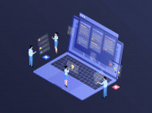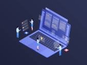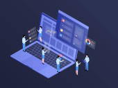 Wydajność pracowników Isometryczna Ilustracja Ciemny Gradient. Nadaje się do aplikacji mobilnych, Witryna internetowa, Baner, Diagramy, Infografiki i inne aktywa graficzne.