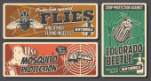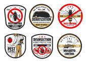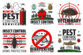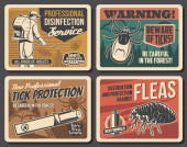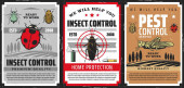 Plakaty wektorowe zwalczania szkodników, kontrola karaluchów, ochrona domu przed owadami, metoda mgławicy na zimno. Eksterminator pracowników w chemicznym kombinezonie ochronnym i masce natryskującej insektycydy, pchły, owady i mrówki