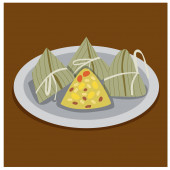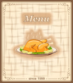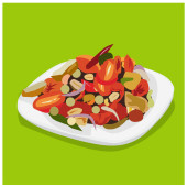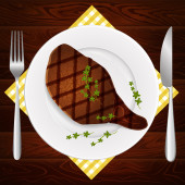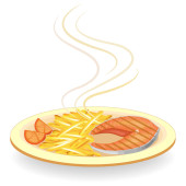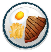 Ilustracja steku wieprzowego z frytkami, spaghetti, warzywa, umieszczone w talerzu na brązowym tle..