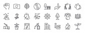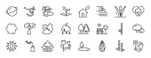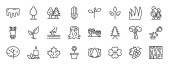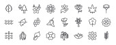 set of 40 nature icons in outline style. thin line icons such as human brian, obovate, trifoliate ternate, solar, yucca, cypress leaf, pine tree on fire, roses, season, subulate, apricot leaf leaf,