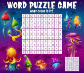 Kreskówka planety kosmiczne i gwiazdy słowo wyszukiwania puzzle wektor gry arkusza pracy. Dzieci quiz siatki, zagadka lub labirynt, kolorowa gra uczenia się na tle gwiazd z planet i planetoid wszechświata galaktyki obcych