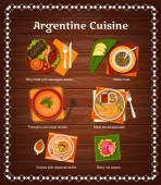 Kuchnia argentyńska obejmuje menu. Gulasz mięsny Guiso, cielęcina trzcina Osso Buco i Cookie churros, kotlet wieprzowy Milanese, Chorizo kanapka Choripan i zupa Locro, ciasto mięsne Empanadas