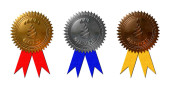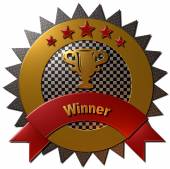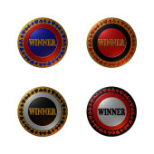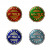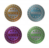 A set of 4 - 3D rendered illustrations of golden metallic seals with text "WINNER" and "INNOVATION" as well as 5 stars, in different coloured metallic texture finish, isolated on a white background.