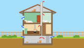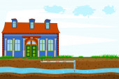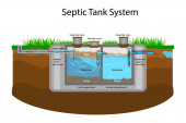 Mobilny system septyczny i system odwadniający. Schemat podziemnego systemu septycznego. Typowy szambo domowe. Zewnętrzna sieć prywatnych oczyszczalni ścieków domowych. Ilustracja wektora