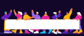 Zdjęcie "Szczęśliwi ludzie trzymający puste transparenty na prezentacji, demonstracji lub rajdzie. Wektor płaska ilustracja grupy aktywistów z białymi plakatami i tabliczką na czarnym tle" może być wykorzystywane do celów osobistych i komercyjnych zgodnie z warunkami zakupionej licencji Royalty-free. Obraz jest dostępny do pobrania w jakości wysokiej rozdzielczości do 5760x3840.