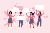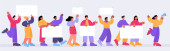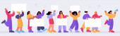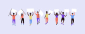 Szczęśliwi ludzie trzymający puste transparenty na prezentacji, demonstracji lub rajdzie. Wektor płaska ilustracja grupy aktywistów z białymi plakatami i tabliczką na czarnym tle
