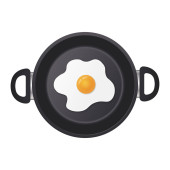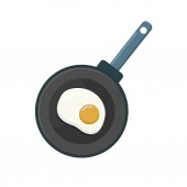 Pan z jajkiem. Smażone jajko na patelni. Smaż na patelni. Ikona omletu i śniadania. Garnek z widokiem na jedzenie. Płaskie logo kuchni. Metalowa patelnia z produktem. Wektor.