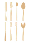 Spoon, knife and fork dishware isolated on white background icon set. Cartoon silver and gold kitchen eating tools silhouette. Flat style vector illustration.