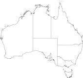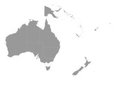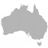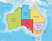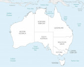 Wektorowa ślepa mapa Australii z regionami i podziałami administracyjnymi oraz sąsiednimi krajami i terytoriami. Warstwy edytowalne i wyraźnie oznakowane.