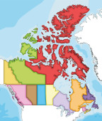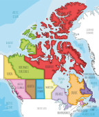 Wektorowa ślepa mapa Kanady z prowincjami i terytoriami oraz podziałami administracyjnymi, a także sąsiednimi krajami i terytoriami. Warstwy edytowalne i wyraźnie oznakowane.