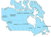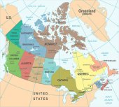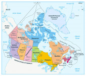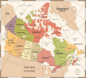 Wektor zilustrował mapę Kanady z prowincjami i terytoriami oraz podziałami administracyjnymi, a także sąsiednimi krajami i terytoriami. Warstwy edytowalne i wyraźnie oznakowane.