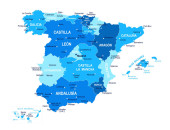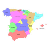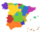 Mapa wektorowa Hiszpanii z regionami i terytoriami oraz podziałami administracyjnymi. Warstwy edytowalne i wyraźnie oznakowane.