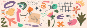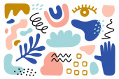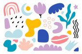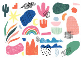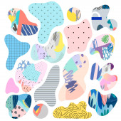 Abstrakcyjne kształty doodle z ręcznie rysowane tekstury, płaski wektor ilustracji izolowane na białym tle. Zestaw modnych kształtów geometrycznych i freehand. Jasne elementy letnie - plamy i tła.