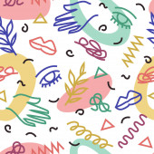 Modny bezszwowy wzór z teksturowanymi abstrakcyjnymi kształtami i bazgrołami, płaska ilustracja wektora na białym tle. Elementy geometryczne, koła, kwiaty, linie i korona. Współczesny bezszwowy wzór.