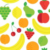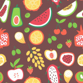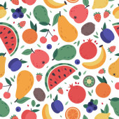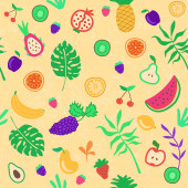 Hand drawn cute seamless pattern fruits, Orange, Banana, Pomeganate, Cherry, Strawberry, Lemon and leaf on pink pastel background. Vector illustration.