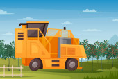 Pickup jazdy na wsi w sezonie letnim. Pojazdy rolnicze retro do transportu i holowania produkcji. Samochód, wiejska droga i bieguny elektryczne. Ilustracja wektora.