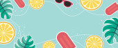 Kolorowy letni bezszwowy wzór z tropikalnych owoców, lodów, liści, Toucan, Flamingo, Kwiaty i ikony lato stylu Memphis. Letni bezszwowy wektor ilustracji