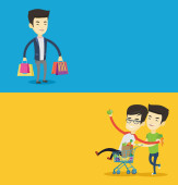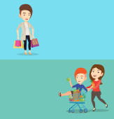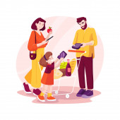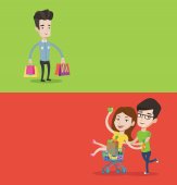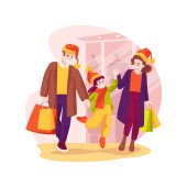 Rodzinne zakupy odosobnione ilustracja wektor kreskówki. Uśmiechnięta rodzina z dziećmi trzymającymi wiele toreb, w centrum handlowym razem, zadowoleni z zakupu, dzieci z pudełkami, centrum handlowe wektor kreskówki.