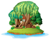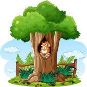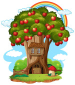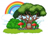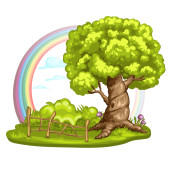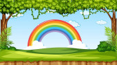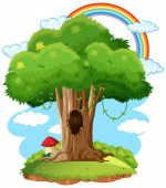 Autumn tree in nature with rainbow in the sky illustration