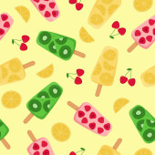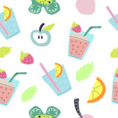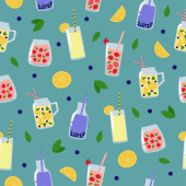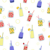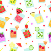 Lato pije płynny wzór. Soki i lemoniady z owocami, jagodami i liśćmi na białym tle.