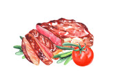 Surowy, posiekany smalec wieprzowy z zieloną cebulą i chlebem żytnim na drewnianym tle. Ukraiński smalec, tradycyjne jedzenie. Ręcznie malowane akwarele do menu, książka kucharska, przepisy kulinarne